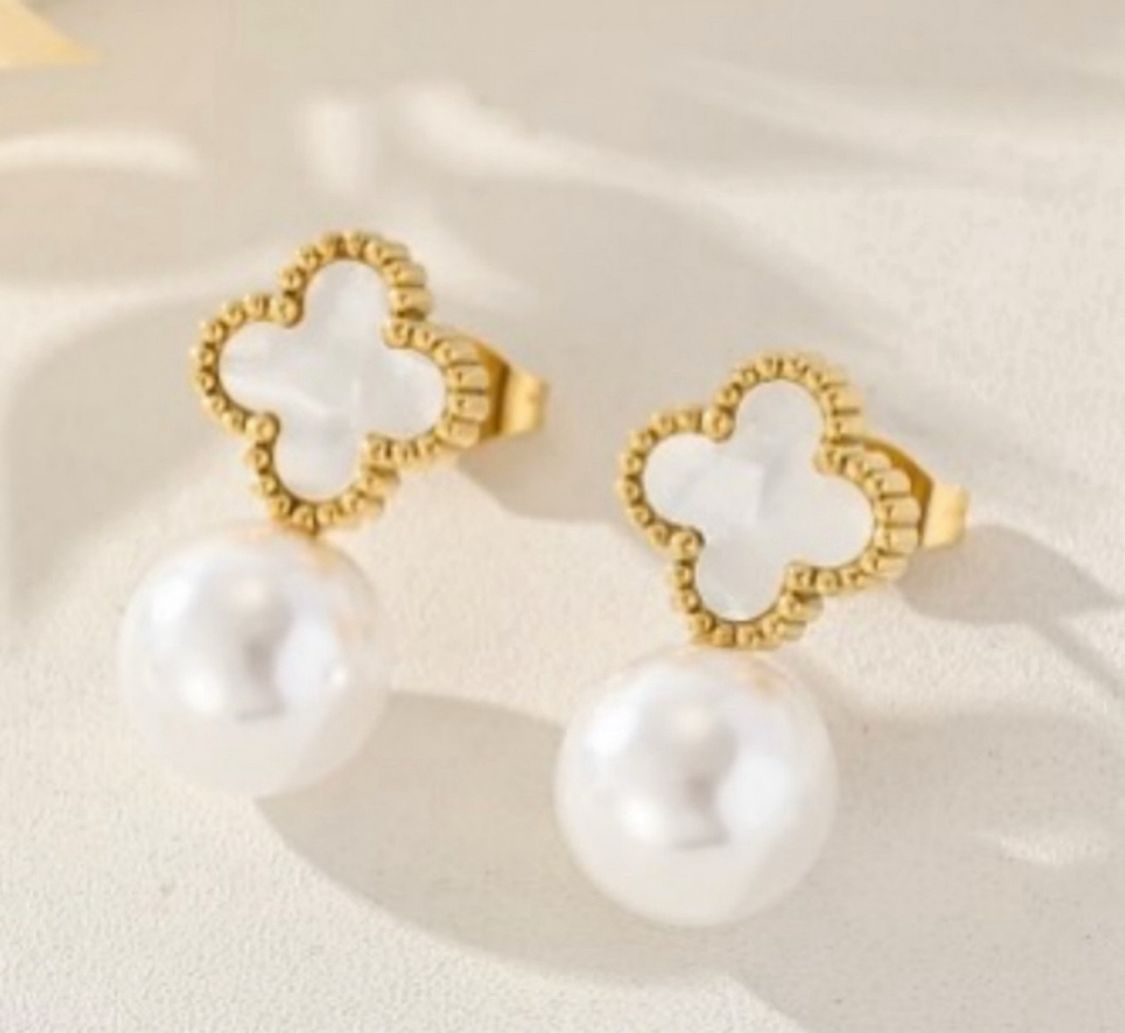 Caravanas de acero bañadas en oro 18 con perlas de rio y trébol de nácar